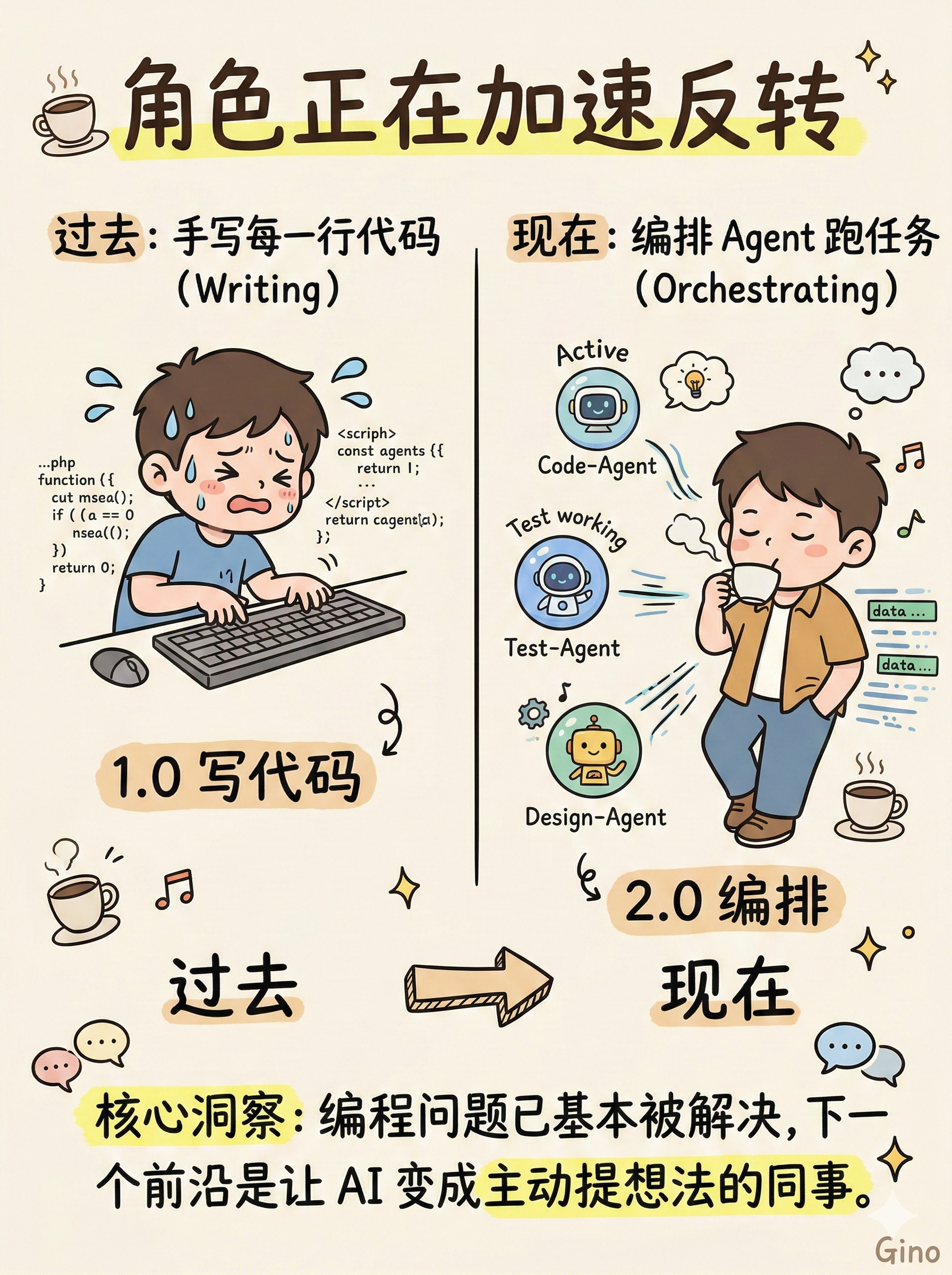 不是因为它新鲜,其实这个概念在分布式系统里用了几十年。更是因为它精确描述了模型能力提升之后正在发生的变化:工程师的核心工作,从亲手写每一行代码,变成了定义任务、拆解问题、调度多个 AI Agent 协同完成工作,然后验收结果。