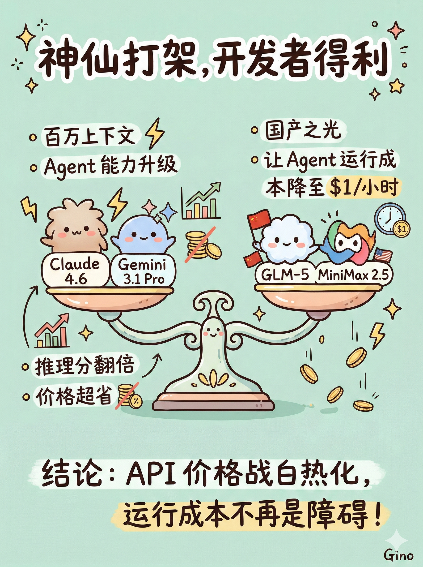 这两周 AI 领域发生了很多事。Claude Sonnet 4.6、Gemini 3.1 Pro、GLM-5、MiniMax M2.5、Seedance 2.0、Nano Banana 2 等新模型密集发布,各家都在加量不加价。这一轮模型层的进步是实质性的:推理能力、编码能力、上下文长度全面跃升,价格却在持续下降。模型能力的突破,始终是整个 AI 领域向前推进的核心动力。