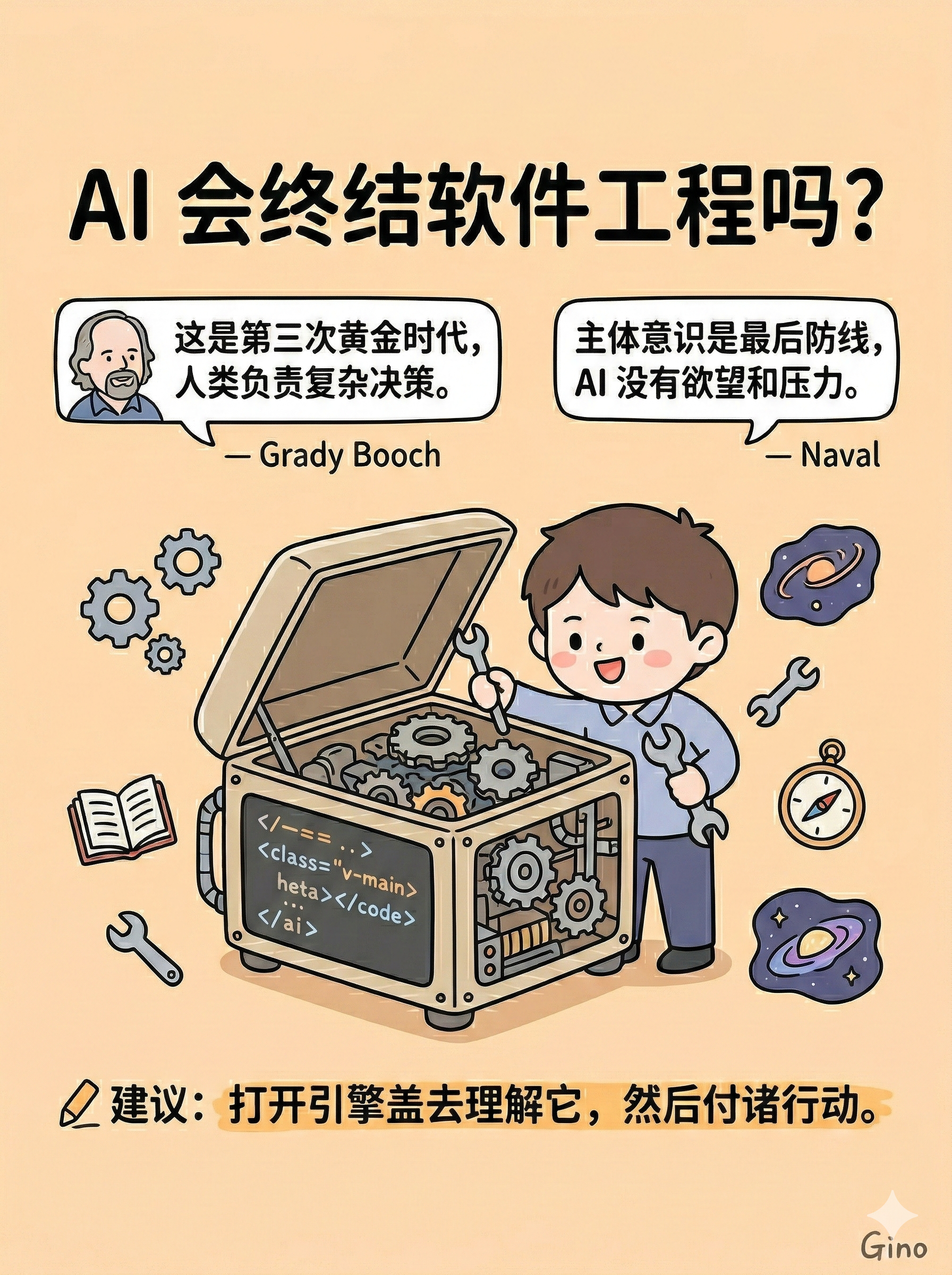 UML 之父 Grady Booch 给出了他的答案:软件工程已经经历过多次存在主义危机,结构化编程来的时候、面向对象来的时候、敏捷来的时候,每一次都有人说软件工程要死了,每一次都以新的黄金时代收场。他驳斥了 Dario 关于 AI 将全面自动化软件工程的判断,认为 AI 处理的不过是另一次抽象层级的跃迁。真正的软件工程是在多种力量之间做权衡取舍,系统思维、复杂性管理和人类判断力才是稀缺能力。