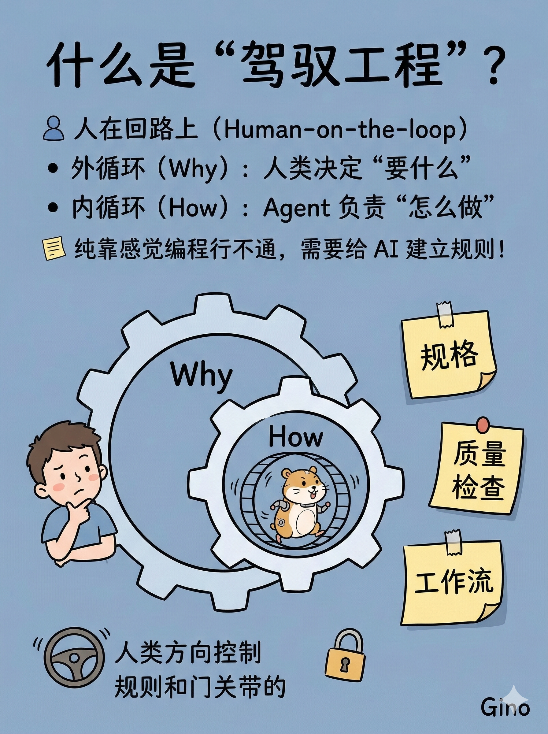 关键问题在于:你能不能完全放手让 Agent 跑内层循环?Morris 的回答是不能。纯粹的 vibe coding 在简单项目上可以工作,但在生产级系统中会导致外部质量失控。他提出的解法是构建驾驭体系,包含规格定义、自动化质量门禁和工作流编排,然后让 Agent 在这个体系内运行。更有意思的是,他描述了一个智能体飞轮:Agent 不仅执行任务,还能反过来改进驾驭体系本身,形成自我增强的循环。
