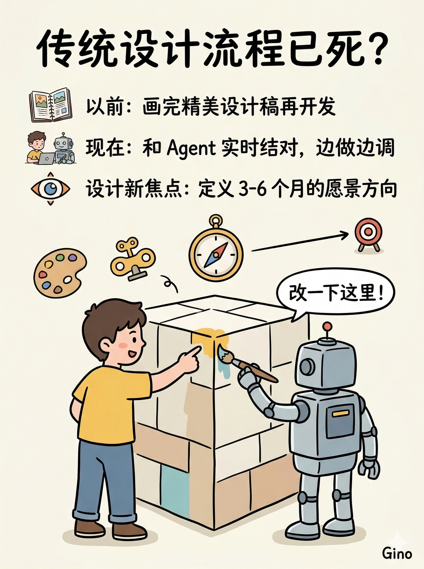 她的核心判断是:传统的设计流程已经死了。那套我们曾奉为圭臬的「发现、发散、收敛、再发散、再收敛」,已经不适用于当下。但引发变化的不是设计师自己,而是工程师借助 AI 工具获得的极速交付能力,倒逼设计跟着改变。用她的话说,不只是设计师觉得自己需要跟上工程师的步伐,连工程师自己都在想,怎么跟上自己的步伐,怎么跟上那 7 个同时运行的 Agent。
