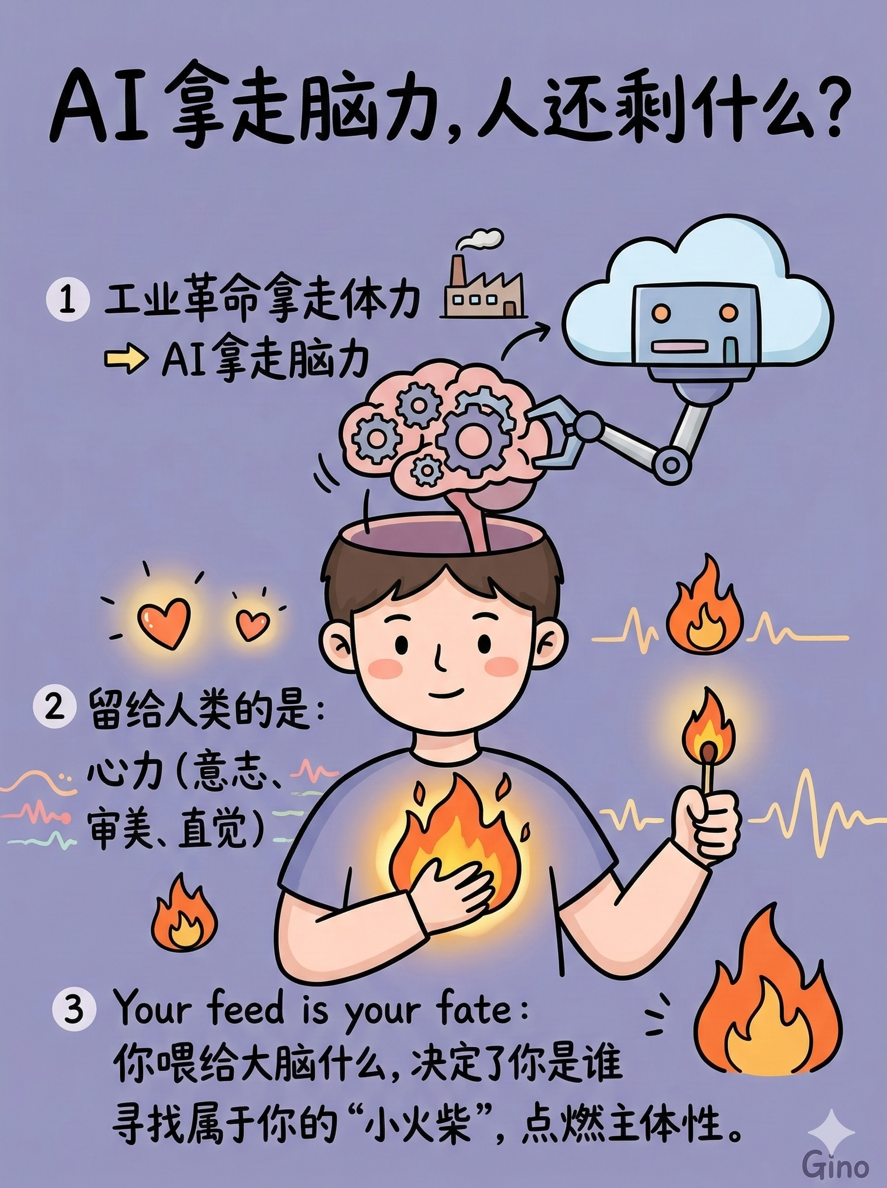 整期播客让我反复思考的一个问题是:当 AI 能做越来越多的事情时,什么是只有人才能做的?李继刚给出的答案是心力,意志、审美和直觉。工业革命拿走体力后,人类并没有变弱,而是发展出了脑力密集的现代文明。AI 拿走脑力后,也许我们会发展出以心力为核心的新文明形态。