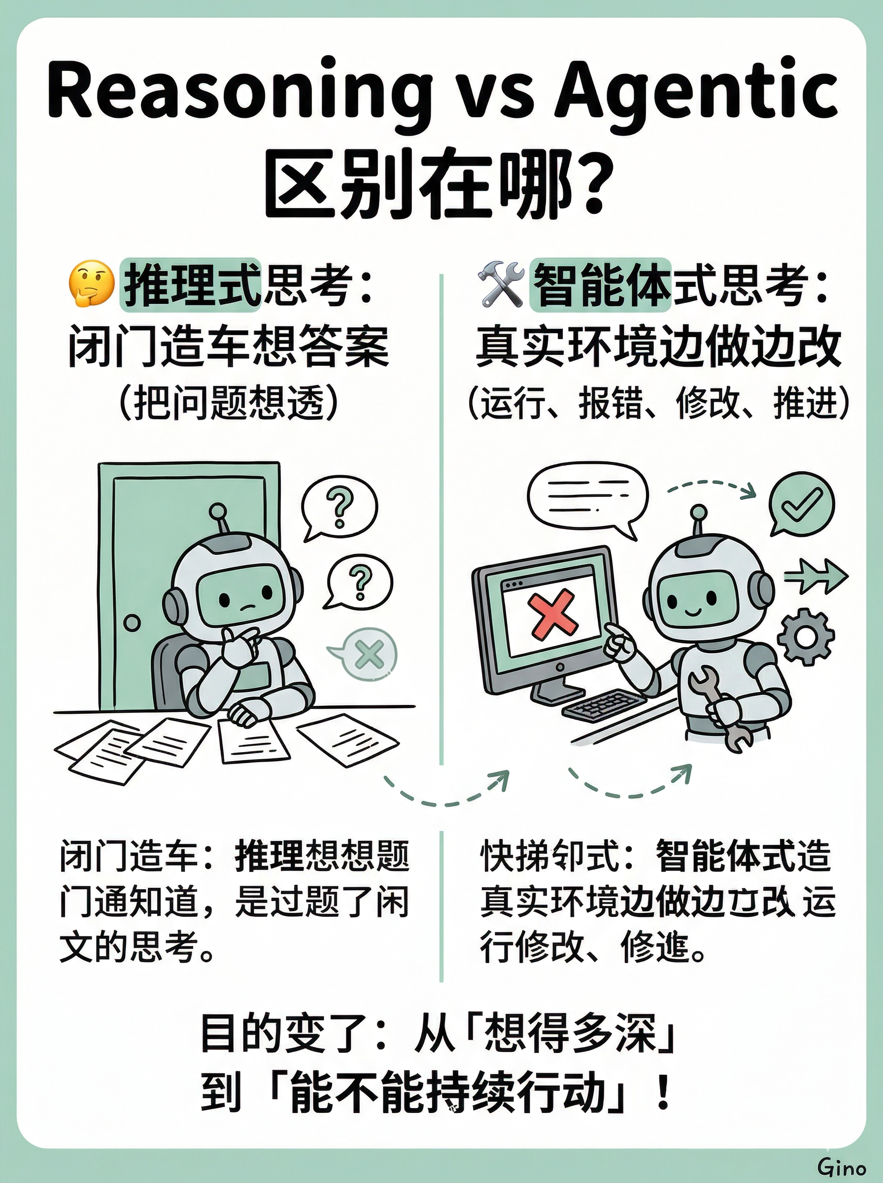 两者的分野,首先落在目的上,其次才是思考有多深。推理式思考追求在给出答案前把问题想透,比如解一道数学证明题。智能体式思考追求在和真实环境的持续交互中把事情往前推。举个例子,纯推理模型只需想清楚代码逻辑,智能体模型却要写完代码后跑测试,发现报错后定位问题,改完再跑一遍,整个过程中随时调整计划。核心问题从「模型能想多深」变成「模型能不能在不断变化的环境中持续有效地行动」。