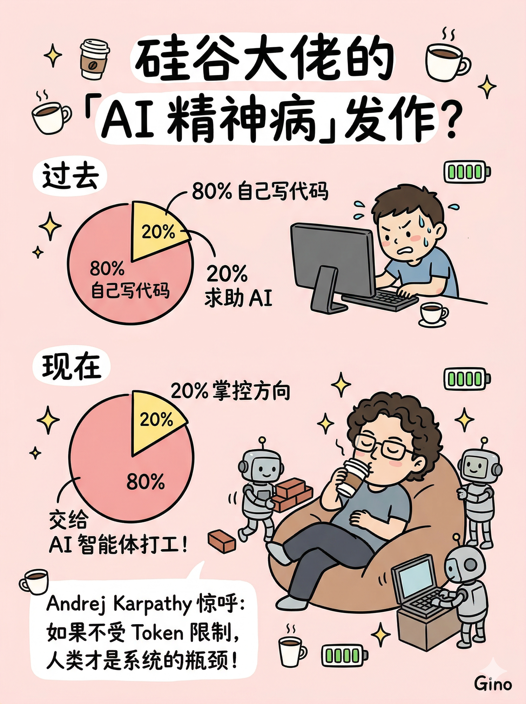 Andrej Karpathy 在 No Priors 的最新访谈从实践者的角度展示了这种转变已经走到了哪里。他说自 12 月以来基本没写过一行代码,工作模式从 80% 自己写 + 20% 交给 AI,变成了 20% 自己把控 + 80% 交给 Agent。他用了一个很有冲击力的词来形容这种状态:AI Psychosis,直译是「AI 精神病」,指的是意识到 AI 拥有近乎无限杠杆时那种兴奋与不安交织的感觉。