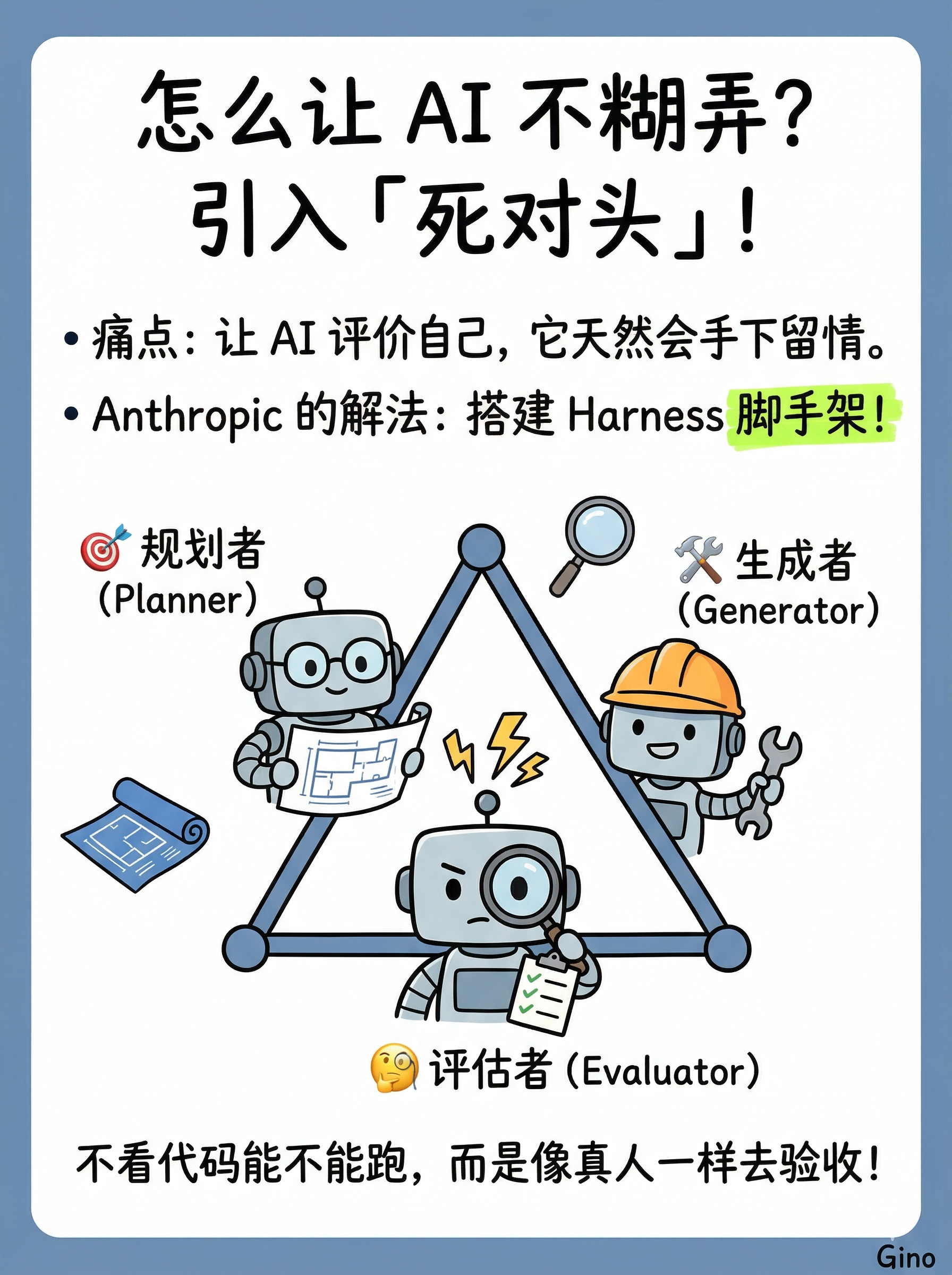他先从前端设计场景入手,发现了一个关键问题:让 Agent 评价自己的作品时,它几乎总是给出正面评价,即使质量明显平庸。这就像让一个人给自己的作文打分,天然会手下留情。他的解决办法借鉴了 GAN(生成对抗网络)的思路,把「做事的人」和「评判的人」分成两个独立的 Agent。调校一个独立的评估者去保持批判性,比让生成者自我批判要容易得多。