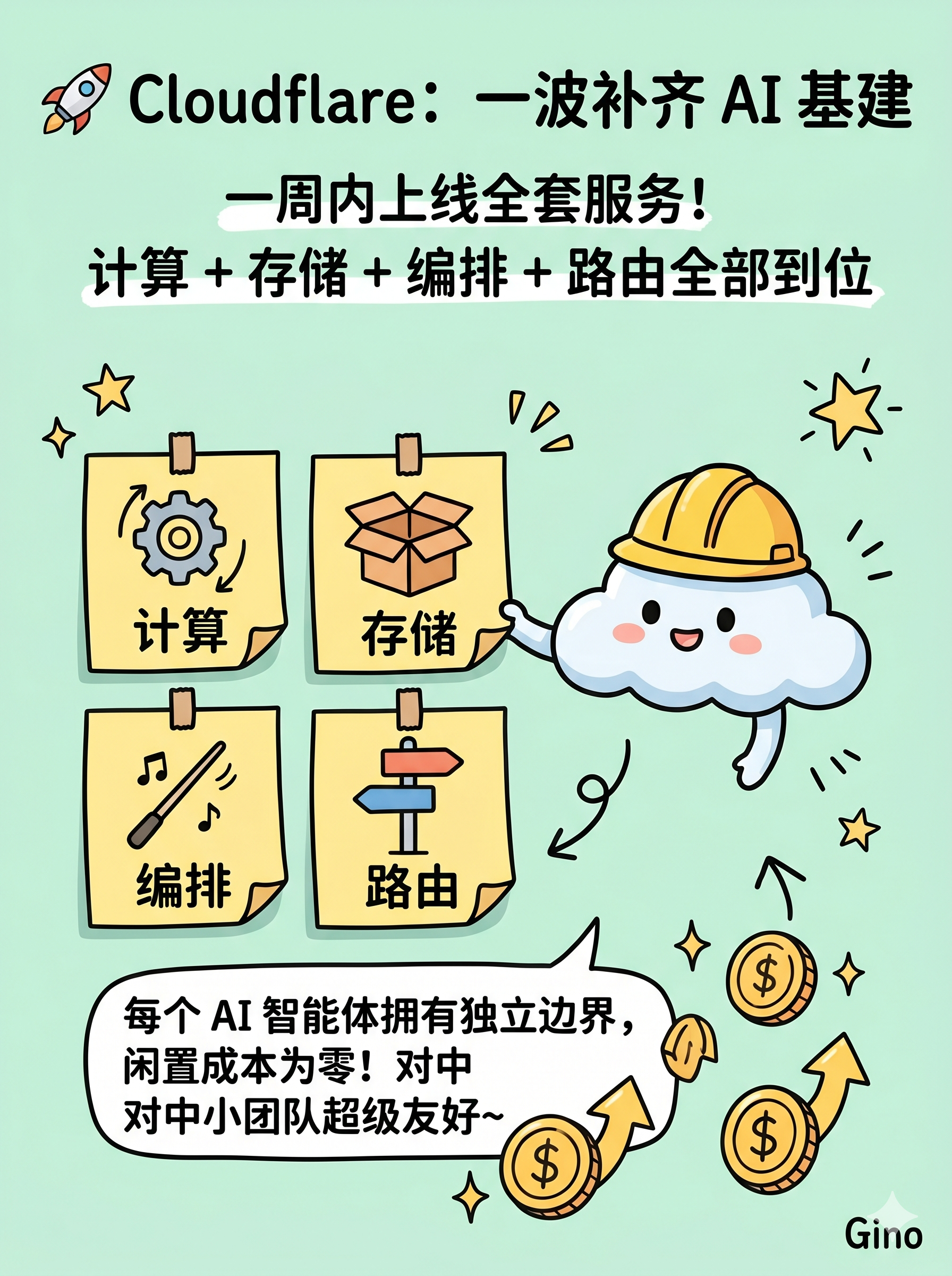 要理解 Cloudflare 这一波为什么重要,得把时间线稍微拉开。过去一年多他们的 AI 基建是步步为营的。Workers AI 把模型跑到了边缘节点;Vectorize 做向量数据库;D1 做边缘 SQLite;Queues 做消息队列;R2 做对象存储;AI Gateway 做推理网关;Agents SDK 做智能体框架;Durable Objects 做有状态的无服务器单元;最近还推出了 Containers on Workers,让容器能跑在边缘。零散看每个都是点状产品,拼在一起是一整套以 Worker 为核心的边缘云。