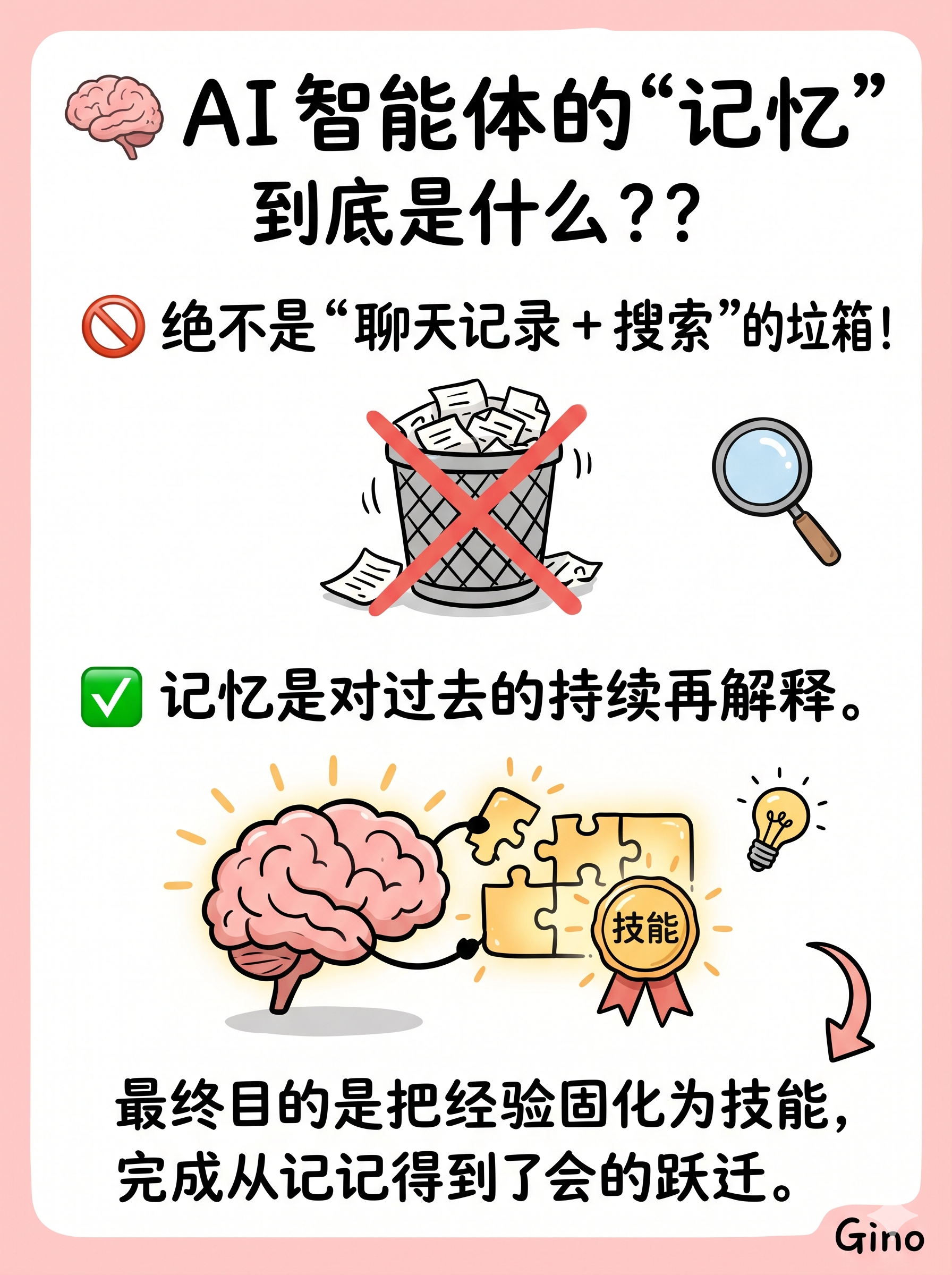 理论那篇来自公众号浮之静,标题就叫《浅谈 Agent Memory》。作者给了一个我觉得特别锋利的定义:记忆不是存取,而是对过去的持续再解释。 他直接开怼一种常见误解:「如果你的 Agent Memory 只做到『存聊天记录 + 向量检索』,那它拥有的不是记忆,只是一个带搜索功能的垃圾箱。」