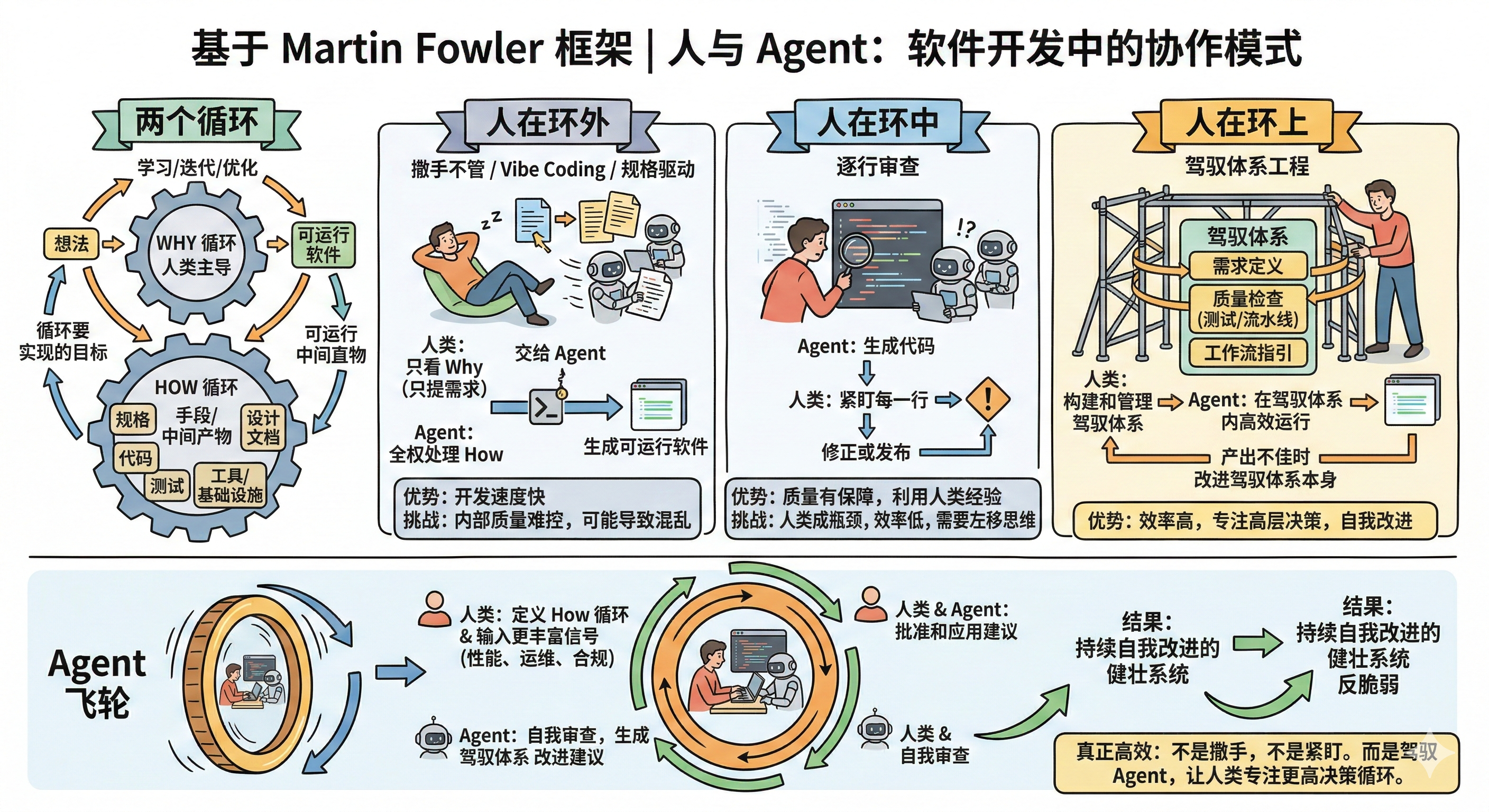 与其亲自检查 Agent 的产出,不如让它们更擅长产出。那套控制 How 循环各层级的规约说明、质量检查和工作流指引,就是 Agent 的驾驭体系(Harness)。构建和维护这套体系的实践叫做驾驭工程(Harness Engineering),也就是人类在环上工作的核心方式。
